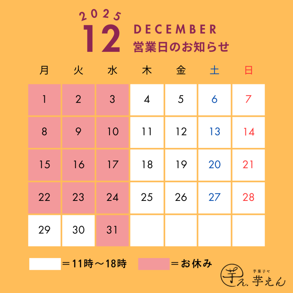 今月は下記の通り営業いたします。年内最終営業日は12月30日でございます。